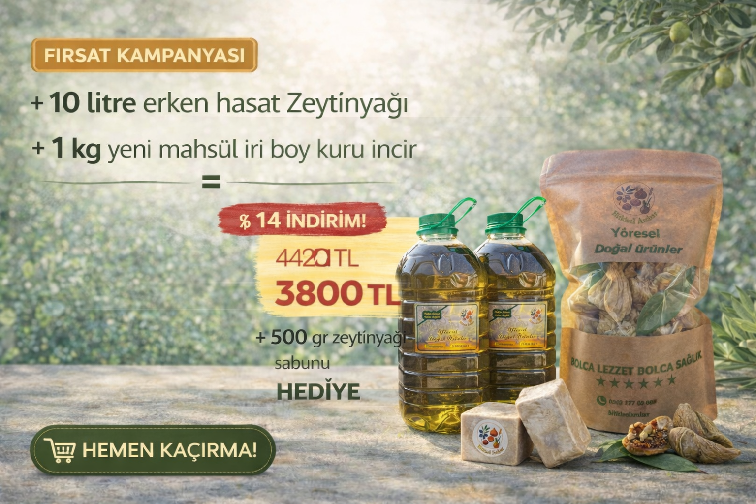 10 litre erken hasat zeytinyağı 1 kilogram yeni mahsül olan iri boy kuru incir ve hediye olarakta 500 gram yani 4 kalıb şeklinde olan zeytinyağı sabunumuz bulunmaktadır fırsatlar yararlanmak için hemen sepete ekle butonuna eklemelisini bence ürünleri iyi kullanmanız dileğiyle ...